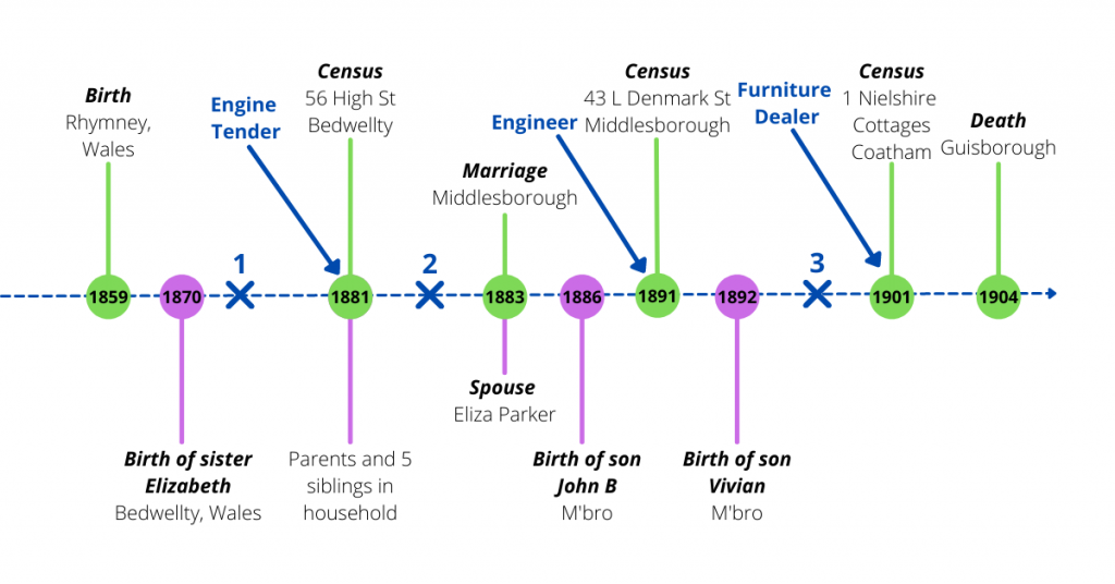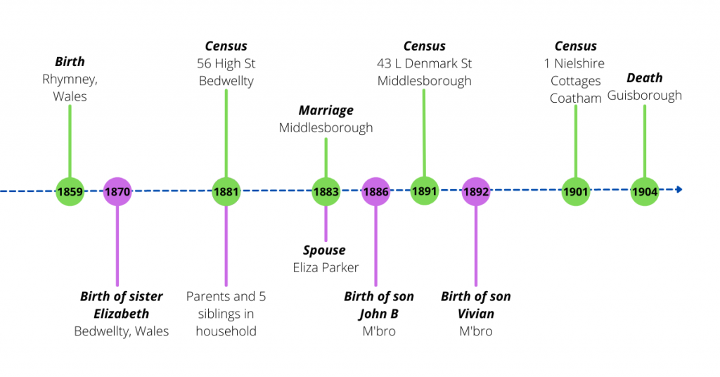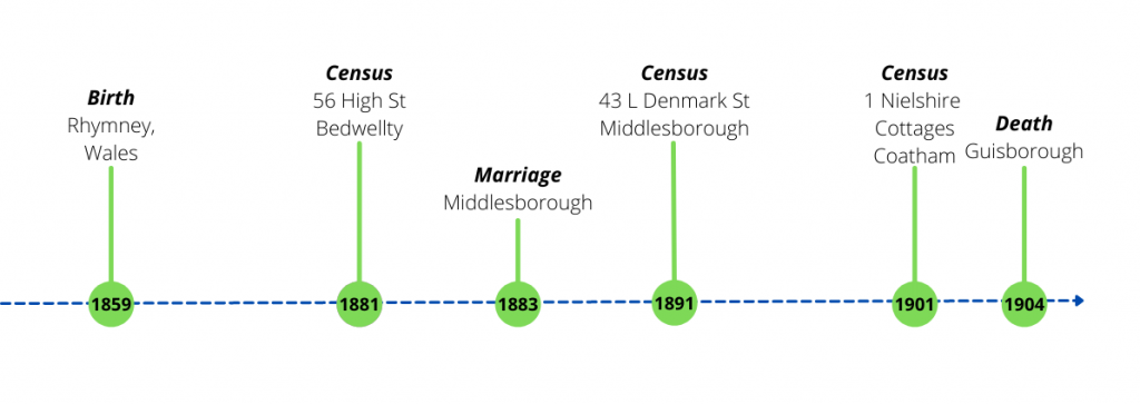 In 1881 James was in Wales, but by 1883 he was marrying Eliza Parker in Middlesborough. A short gap, but an important one. Can we find any further records that help us discover why he moved, and when? Did his family move with him?