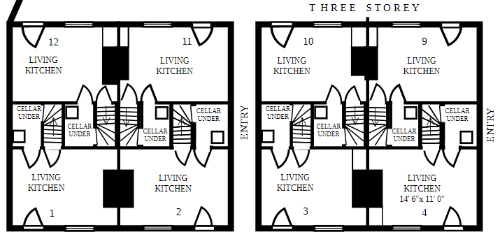 Smith Street is today called William Street, and the houses are more modern. But it looks from this map of that there was a block of back-to-backs on the street, and a couple of larger houses. Back-to-backs are now banned as new builds, although there are still plenty around in the UK. The presence of a single “living kitchen” per house in this diagram will give you an idea about how small these houses generally were.