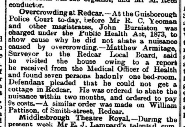 And remember those 15 people in a house in 1911? Well, John’s extended family had already caused him difficulty, as in 1896 he was charged under the Public Health Act, 1873 for overcrowding. Does this explain all the Burniston lodgers in 1901?