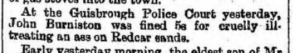 Searching for this conviction in the North Yorks Record Office it turns out that George and Thomas Burniston were convicted a week earlier on 14th July 1885 of “permitting a pony to stand and ply for hire without a licence“. George was also convicted in the 1880s for “being the owner of a horse found straying on the highway“, “having unjust weights in his possession for use in trade” and “ill-treating a pony by causing it to be worked when it was unfit“.